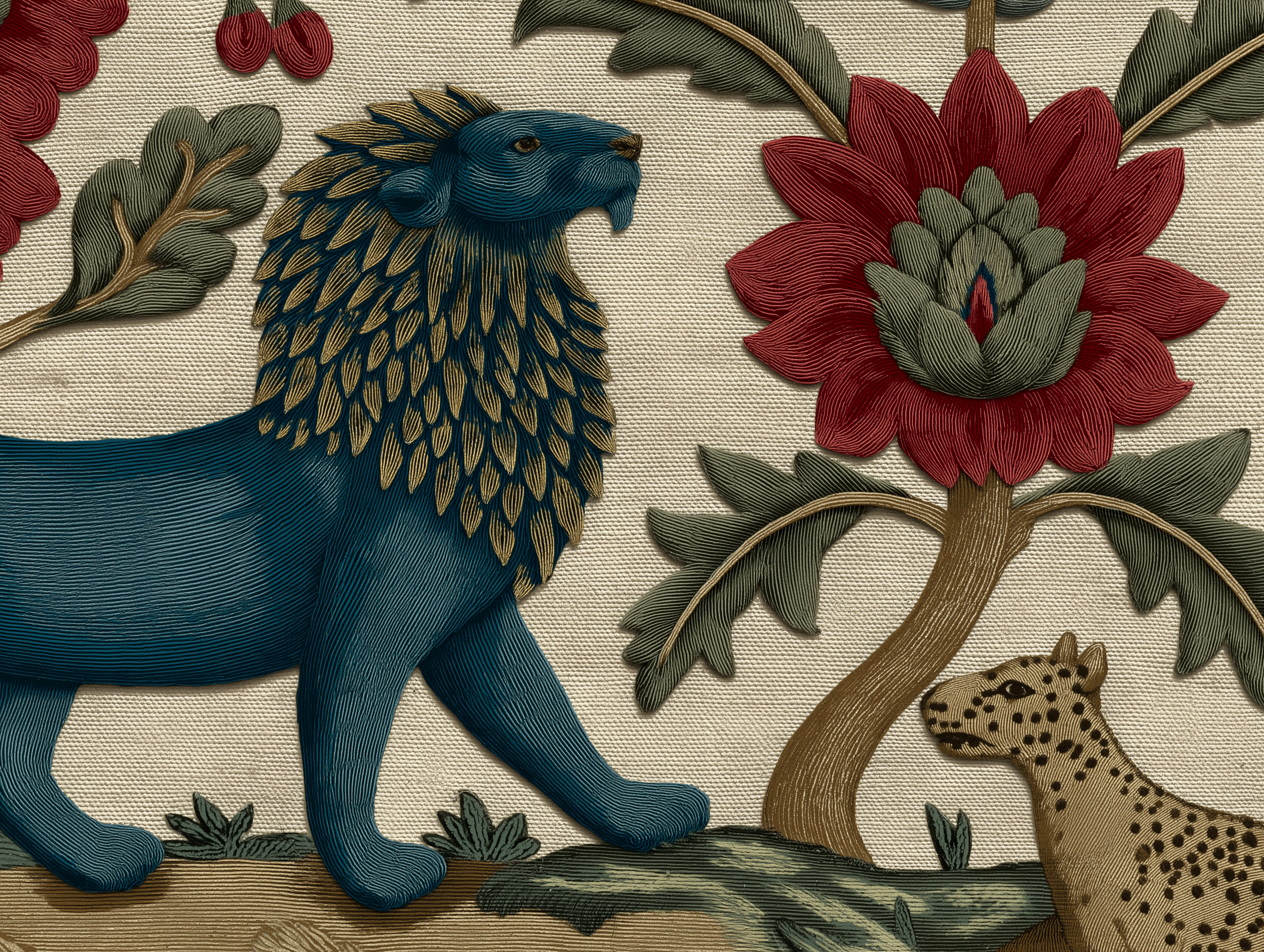 The word chintz comes from the Hindi word chint, meaning spotted or variegated. What arrived in European ports were lengths of cotton alive with birds, flowering trees, and botanical gardens rendered in vivid reds, blues, and greens.